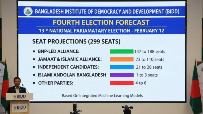 ত্রয়োদশ জাতীয় সংসদ নির্বাচনে ৬৫ থেকে ৬৮ শতাংশ ভোট পড়লে বিএনপির নেতৃত্বাধীন জোট একক সংখ্যাগরিষ্ঠতা পেতে পারে। আর এই হার যদি ৫৩ থেকে ৫৮ শতাংশ হয় এবং উচ্চমাত্রায় সংগঠিত ও আদর্শ ভোটারের আধিপত্য থাকে, তাহলে জামায়াতে ইসলামীর নেতৃত্বাধীন ১১–দলীয় নির্বাচনী ঐক্যের সরকার গঠনের সম্ভাবনা তৈরি হবে। এমন পূর্বাভাস দিয়েছে বাংলাদেশ ইনস্টিটিউট অব ডেমোক্রেসি অ্যান্ড ডেভেলপমেন্ট (বিআইডিডি)। গতকাল সোমবার প্রকাশিত প্রতিষ্ঠানটির এক প্রতিবেদনে এমন পূর্বাভাস দেওয়া হয়েছে।