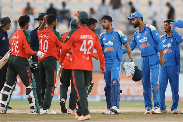 ১৯৫ রানের লক্ষ্যে ব্যাট করতে নেমে ভারতও কড়া জবাব দেয়। বৈভব সূর্যবংশী (১৫ বলে ৩৮) এবং প্রিয়াংশ আর্যর (২৩ বলে ৪৪) ঝড়ো ব্যাটিংয়ে পাওয়ার প্লেতেই চালকের আসনে বসে ভারত। শেষদিকে জিতেশ শর্মা (৩৩) ও আশুতোষ শর্মা (১৩) চেষ্টা চালালেও বাংলাদেশের নিয়ন্ত্রিত বোলিংয়ে চাপে পড়ে তারা।